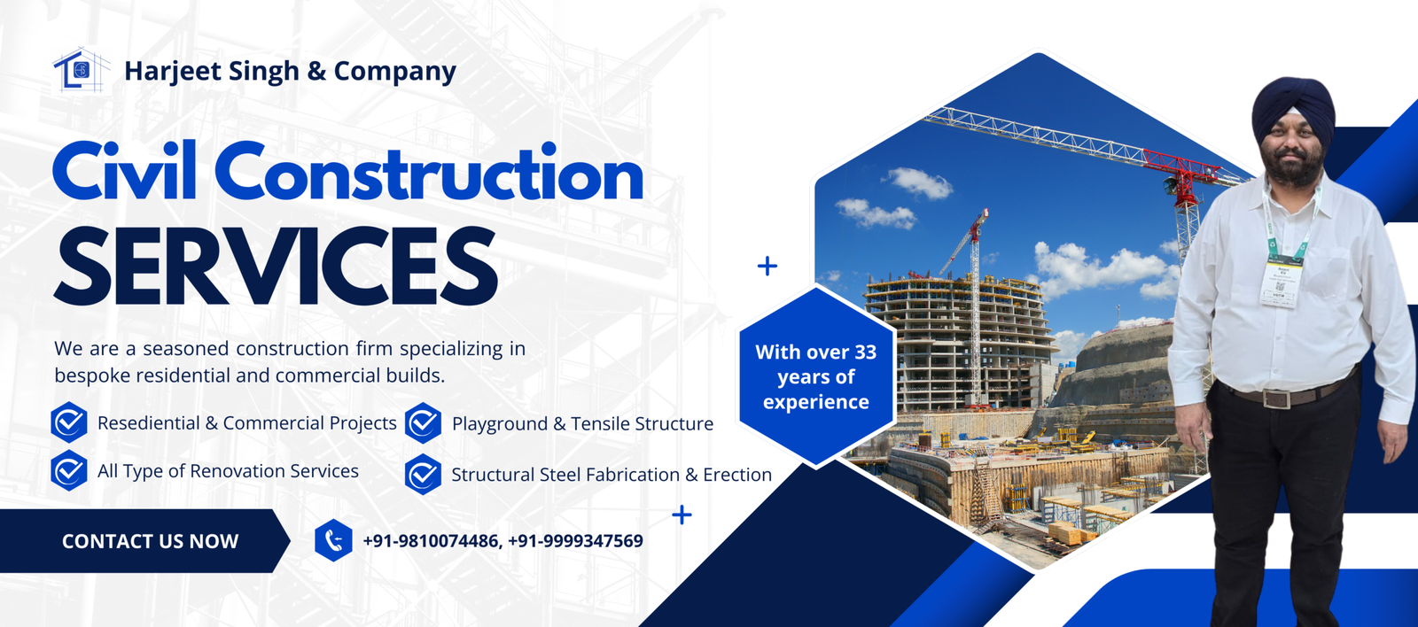 Harjeet Singh & Company is a reputed civil construction,waterproofing and interior design firm based in New Delhi, with operations across India. With over 33 years of experience, we have delivered a wide range of residential, commercial,institutional, and industrial projects, earning a reputation for quality, precision, and professionalism.